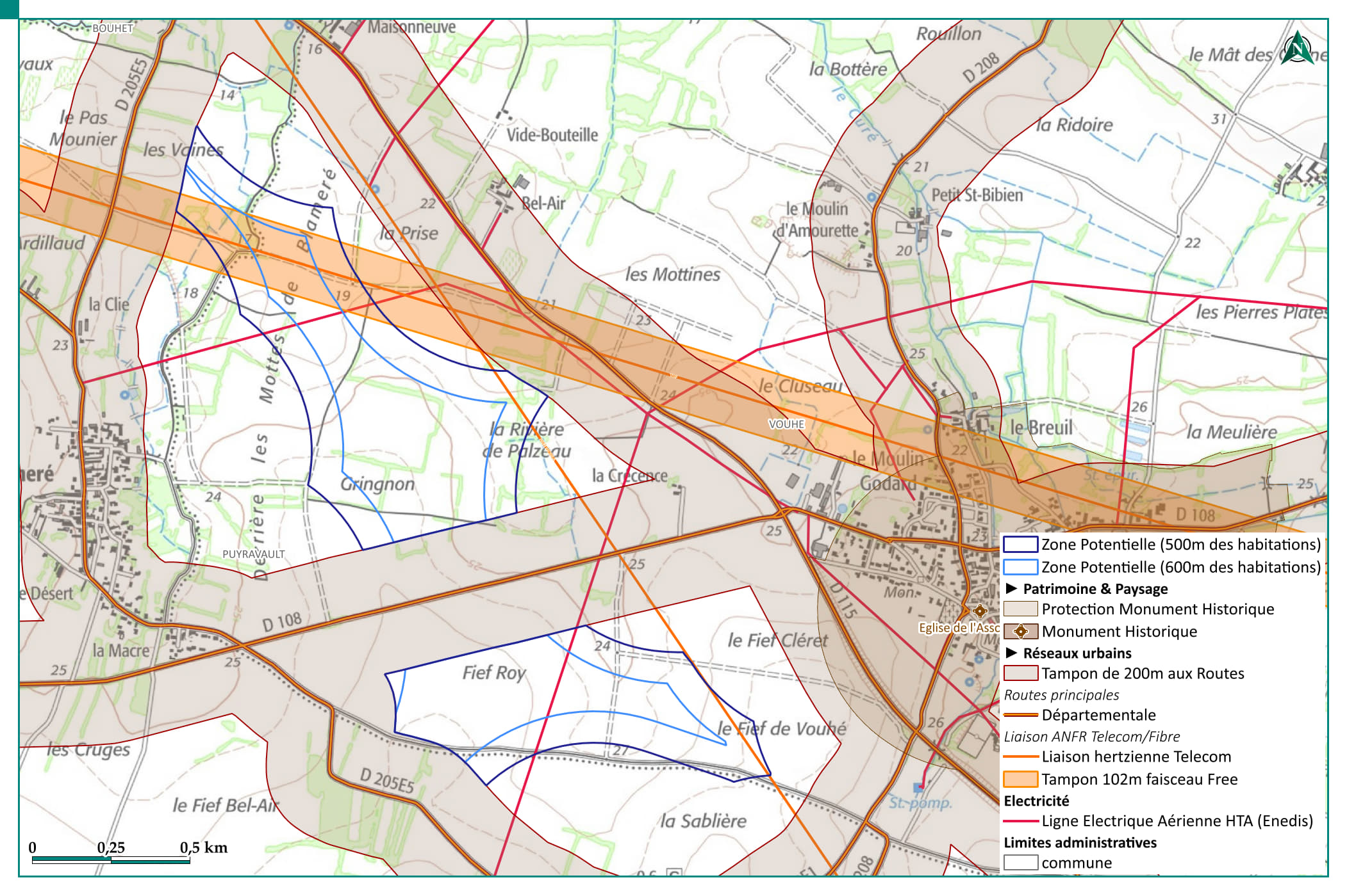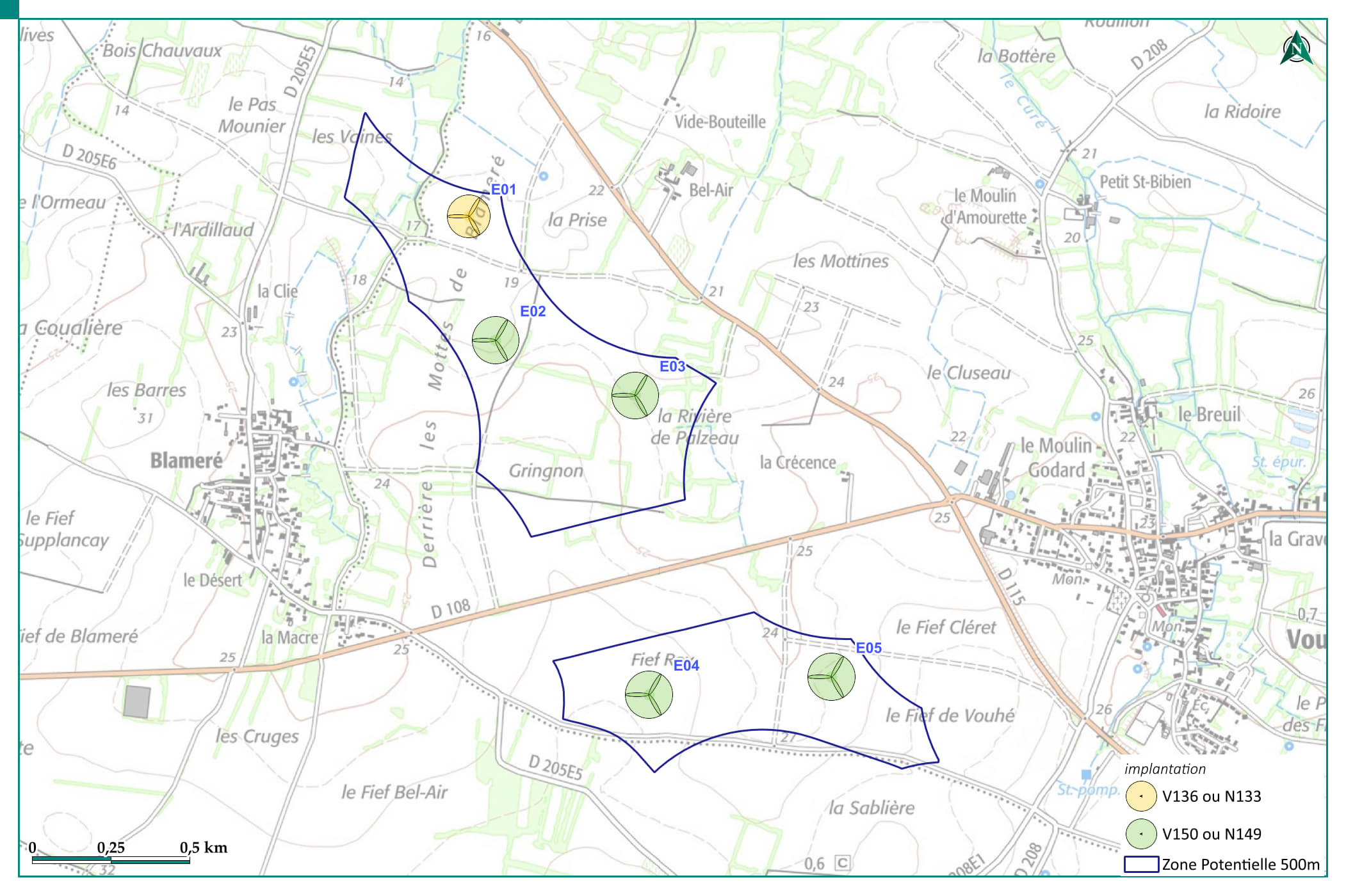 Le projet éolien du Gringnon est situé sur la commune de Vouhé. Ce projet se situe de part et d'autre de la route départementale D108.